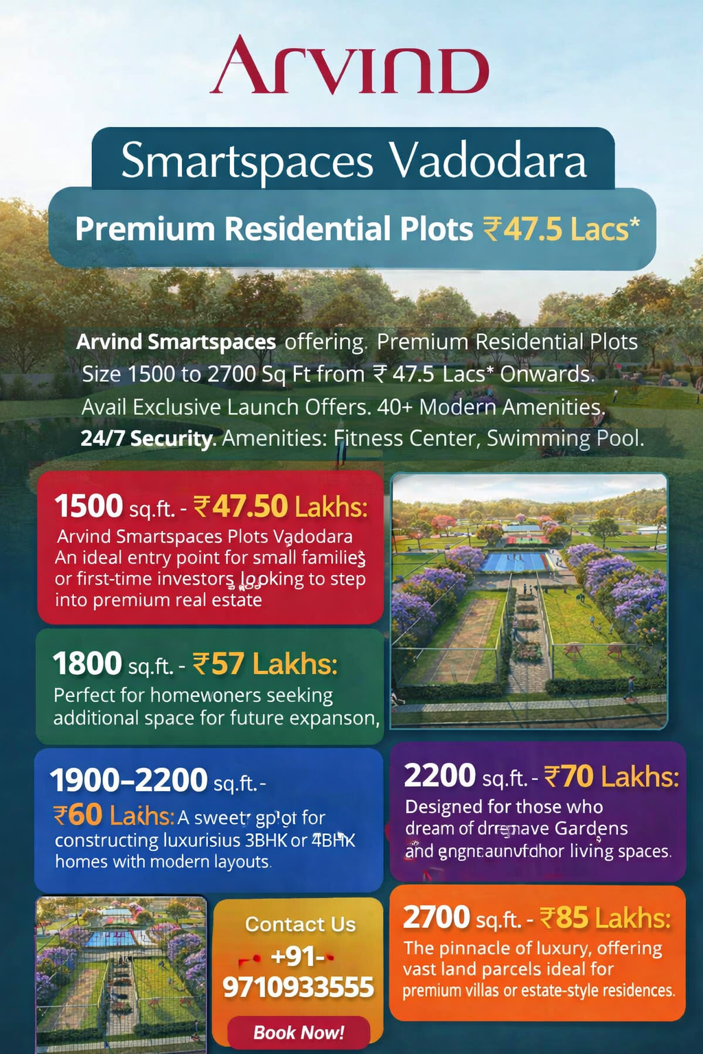 Vadodara is rapidly emerging as one of Gujarat’s most promising real estate destinations, and Arvind Greenfield Vadodara stands out as a premium plotted development for discerning homebuyers and investors. Developed by Arvind SmartSpaces, this thoughtfully planned project offers premium residential plots starting from ₹47.5 Lacs*, combined with modern amenities, excellent connectivity, and a secure living environment.